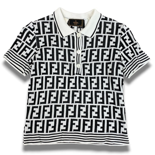 Ac2 FENDI フェンディ ヴィンテージ ニットポロシャツ ズッカ柄 S相当 ホワイト、ブラック レディース トップスk02i
