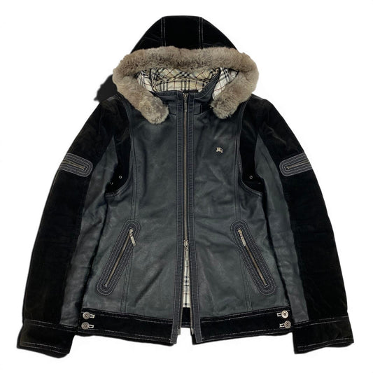 4d16 BURBERRY BLACK LABEL バーバリー ブラックレーベル 中綿 レザージャケット フーデッドジャケット 2way コーデュロイ切替 ラビットファー サイズM ブラック メンズ 紳士服u02t