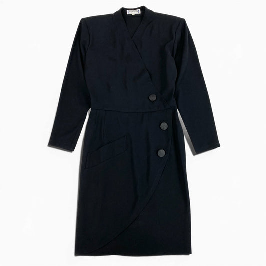 67a3 Vintage Yves Saint Laurent ヴィンテージ イブサンローラン 長袖 ラップワンピース Wrap Dress Large Buttons S ブラック レディースo07t