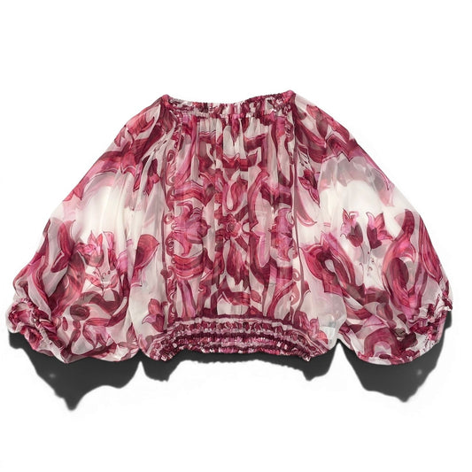 7d24 DOLCE&GABBANA ドルチェアンドガッバーナ マジョリカ シアーブラウス シルクブラウス ドルマンスリーブ パフスリーブ 総柄 マヨルカ サイズ42 マルチカラー シルク100% レディース 女性服o07t