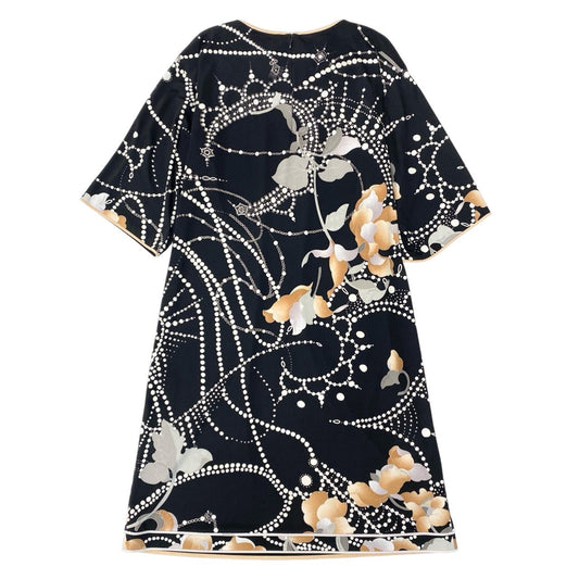 31b6 【美品】LEONARD レオナール 五分袖ロングワンピース 美しい花柄プリント 総柄 0320320 40サイズ ブラック カンカン素材 レディース 女性用u02t