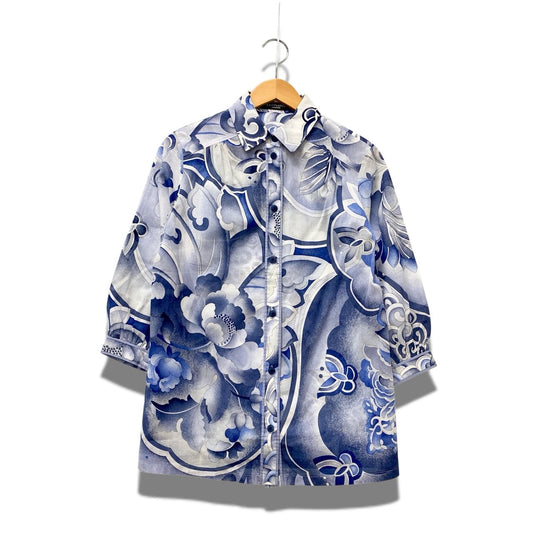 77b17 LEONARD レオナール ロングスリーブシャツ シースルー 総柄プリント 0531133 40サイズ ホワイト ブルー コットン100% レディース 女性用u02t