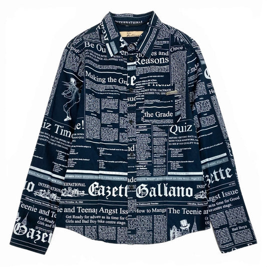 65b10【美品】John Galliano ジョンガリアーノ ヴィンテージ ロングスリーブボタンダウンシャツ ニュースペーパー柄 12サイズ ブラック ホワイト メンズ 男性用k02i