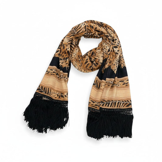 3d16 LEONARD FASHION レオナール フリンジストール 総柄プリント ウールシルク混 ベージュ ブラック レディース 女性用u02t