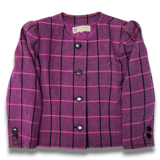 46c24 GIVENCHY ジバンシー ノーカラージャケット ウールジャケット パフスリーブ チェック柄 13B2サイズ ピンクパープル ウール100% レディース 女性用o07t