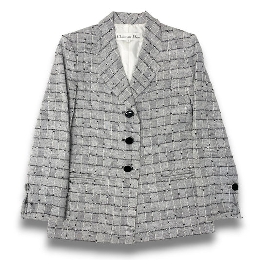 20c24 Christian Dior クリスチャンディオール ツイードジャケット テーラードジャケット ブレザー 三つ釦 チェック柄 9サイズ グレー系 レディース 女性用o07t