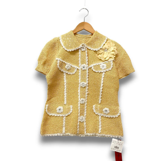 79c26 【未使用タグ付】 NOKO-OHNO ノコオーノ 定価¥42.000 プリーツジャケット 半袖 花柄ボタン コサージュ フリルデザイン レディース 女性服 サイズ40 イエロー系u02t