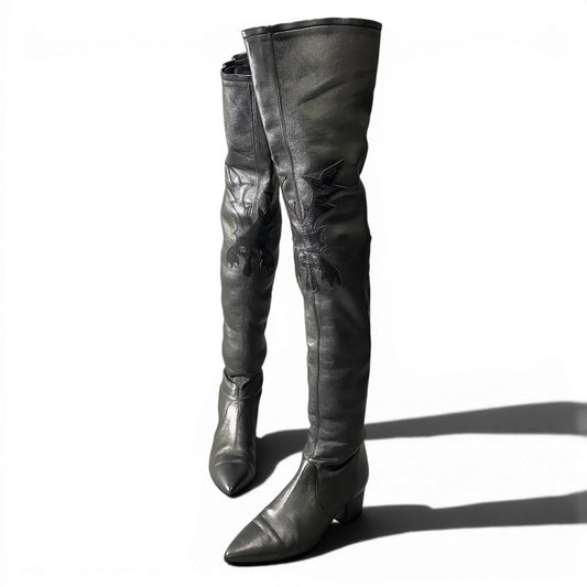 d16 CHANEL シャネル ウエスタンデザイン ニーハイブーツ サイズ37C メタリックブラック レザー レディース 靴ta1
