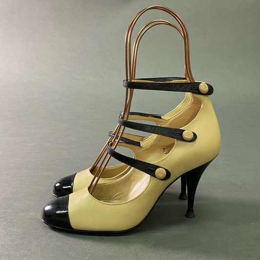 7b12 CHANEL シャネル トリプルストラップ ヒールパンプス 3連ベルト ピンヒール ハイヒール ココマーク バイカラー イタリア製 レディース 34 ベージュ ブラック レザー