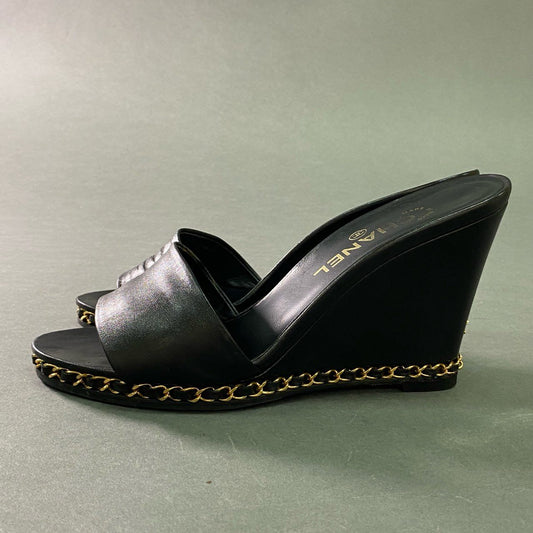 7b12 CHANEL シャネル ウェッジソール レザーサンダル オープントゥ チェーン装飾 ココマーク イタリア製 レディース 39 ブラック 本革