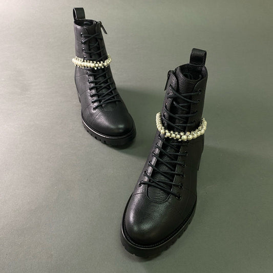 3b7 JIMMY CHOO ジミーチュウ CRUZ FLAT クリスタル パールブーツ 36 1/2 ブラック レザー ビジュー シューズ イタリア製