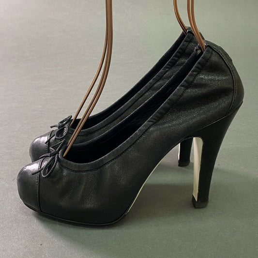 7b12 CHANEL シャネル ラウンドトゥ ヒールパンプス ハイヒール ココマーク リボン イタリア製 レザー 履き口ゴム◎ 37C ブラック 本革