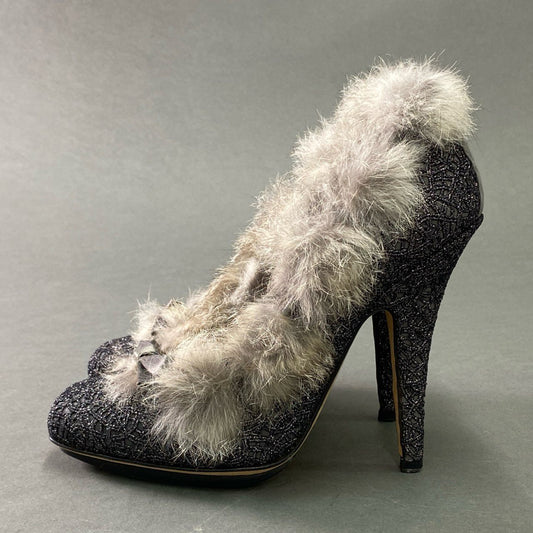 4b7 Christian Dior クリスチャンディオール ファーリボンパンプス 38 グレー ラメ グリッター イタリア製 シューズ