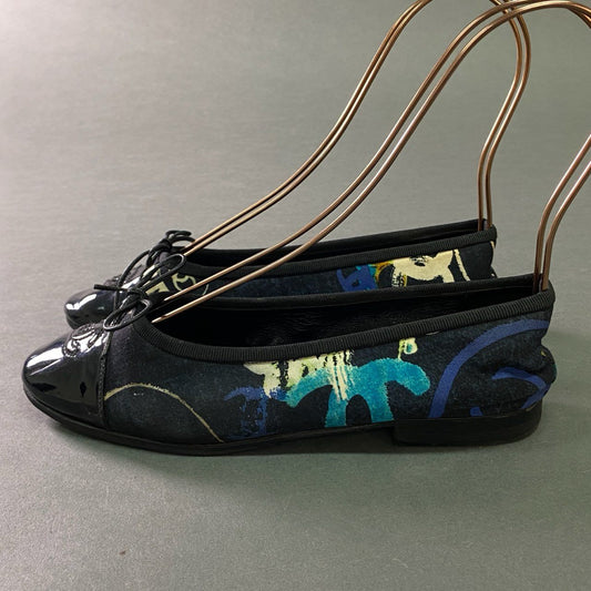 7b12 CHANEL シャネル フラットパンプス バレエシューズ ココマーク ロゴプリント リボン イタリア製 レディース 34 ブラック