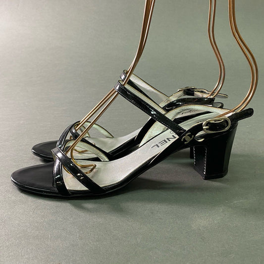 7b12 CHANEL シャネル アンクルストラップ ヒールサンダル チャンキーヒール ココマーク イタリア製 レディース 36 1/2 ブラック エナメル