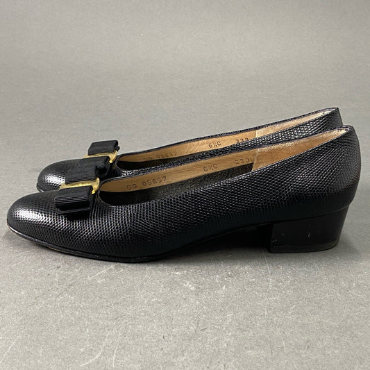 5f11 Salvatore Ferragamo サルヴァトーレフェラガモ ヴァラリボン リザード パンプス サイズ6 1/2C ブラック レザー レディース 婦人 女性靴