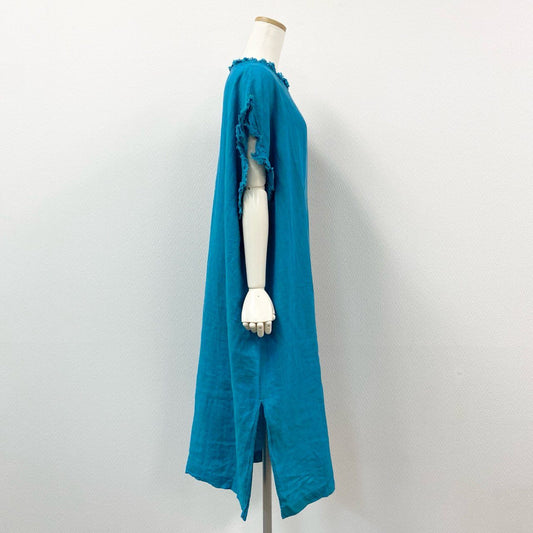 48h14《美品》 HOUSE OF LOTUS ハウスオブロータス カットオフリネンワンピース ロングワンピース フレンチスリーブ サイズM ブルー 麻 リネン100 レディースu02t