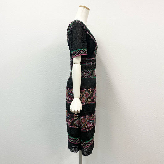 81h7《美品》 TADASHI SHOJI タダシショージ 半袖ワンピース 膝丈ワンピース レース刺繍 タイトスカート 0 ブラック マルチカラー レディースk02i