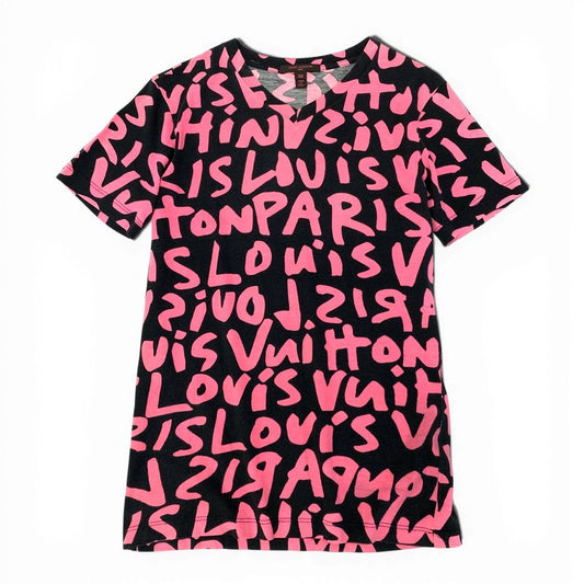 86a15 【Vintage】LOUIS VUITTON ルイヴィトン グラフィティ 半袖Tシャツ サイズXS ブラック ピンク レディース トップスk02i