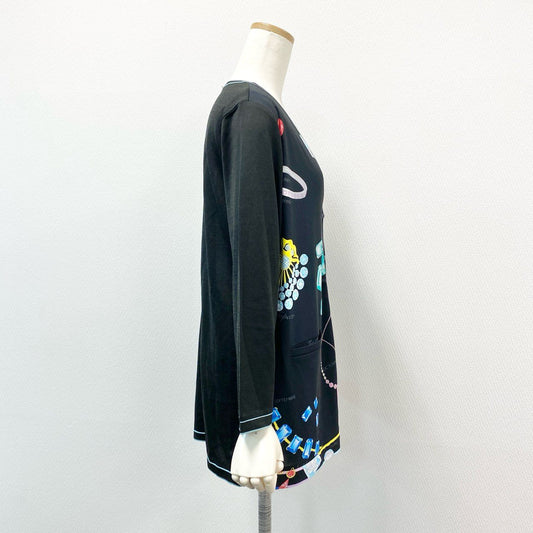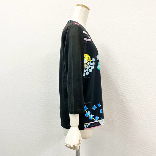 67g21-4 《美品》 LEONARD レオナール カンカン素材切替 薄手ニット セーター 7分袖 美しいプリント サイズ42 ブラック マルチカラー レディース 日本製