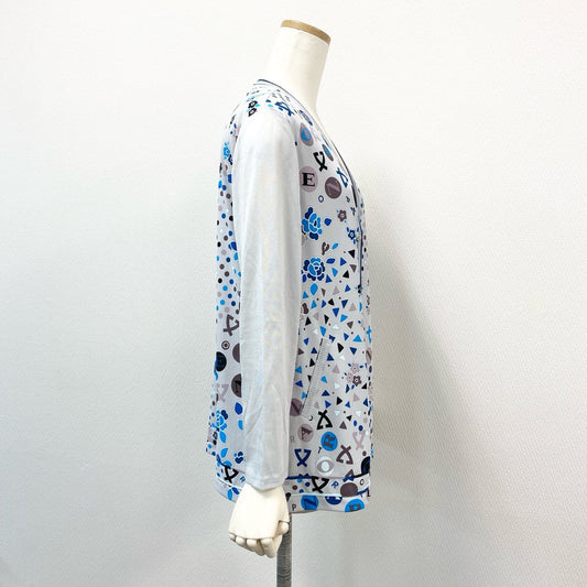 67g21-8 《極美品》 LEONARD レオナール カンカン素材切替 薄手カーディガン ニットカーディガン 美しい花柄プリント サイズ42 ライトグレー ブルー レディース 日本製