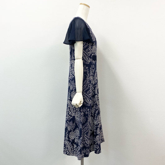 61g23 LAURA ASHLEY ローラアシュレイ タグ付 フレンチスリーブ ワンピース ドレス 総柄プリント 9号 ネイビー コットン レディース