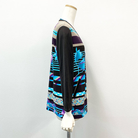 67g21-9 《極美品》 LEONARD レオナール カンカン素材 薄手カーディガン ニットカーディガン 美しいプリント サイズ42 ブラック マルチカラー レディース 日本製