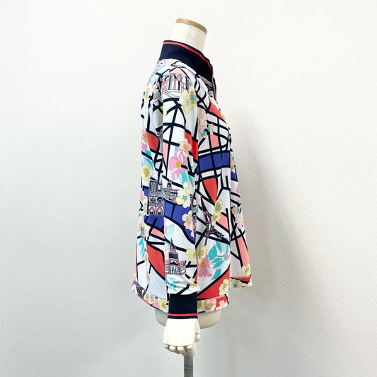 67g21 《美品》 LEONARD レオナール 伸縮ストレッチ 長袖シャツ ブラウス トップス 美しい花柄プリント ハーフジップ マルチカラー サイズ42 ポリエステル レディース 日本製