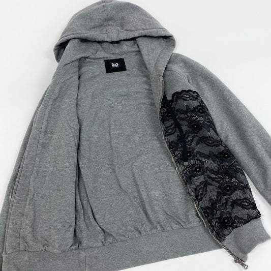 11f12 DOLCE&GABBANA ドルチェアンドガッバーナ 長袖パーカー 羽織 レース切替 フーディーパーカー フルジップ トップス レディース 38 グレー 画像参照
