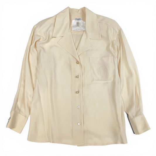 10a13 CHANEL シャネル ロングスリーブシャツ オープンカラー シルクブラウス ココマーク パールボタン レディース 女性用 アイボリー シルク100% Vintage shirt with pearl Coco mark buttonst18r