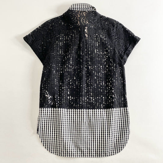 42i20 N°21 ヌメロ ヴェントゥーノ ギンガムチェック レース切替 半袖シャツ ブラウス サイズ36 ブラック ホワイト コットン レディース