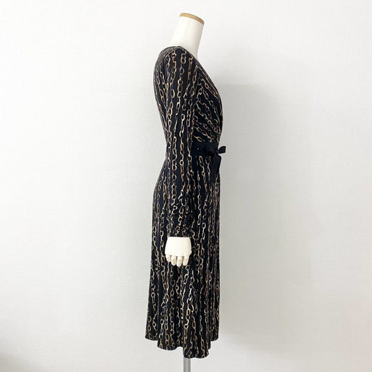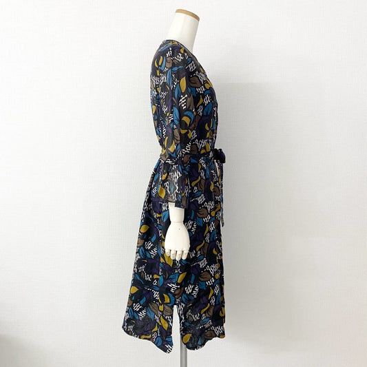 23h21 《未使用保管品》 定価¥82,500 タグ付 S MaxMara エスマックスマーラ 長袖ワンピース ドレス ロングスリーブ ウエストベルト 総柄プリント 前開き 38 ネイビー ラミー