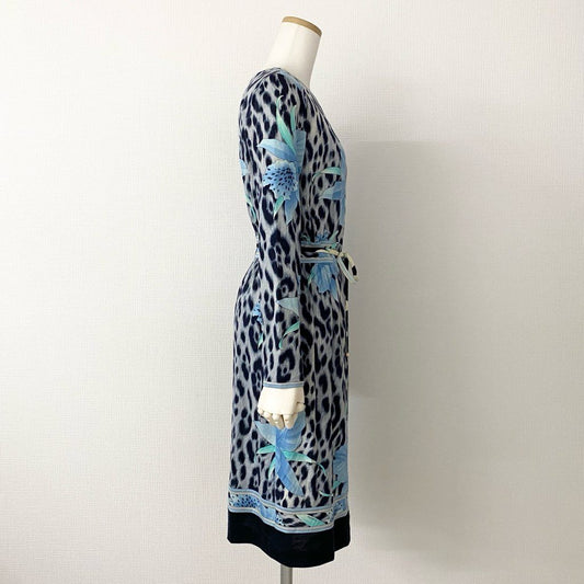 48h13 日本製 LEONARD レオナール 長袖ワンピース 花柄ワンピース 膝丈 ベルト付き 花柄/レオパード 0340905 サイズ38 ブルー×グレー ウール レディース