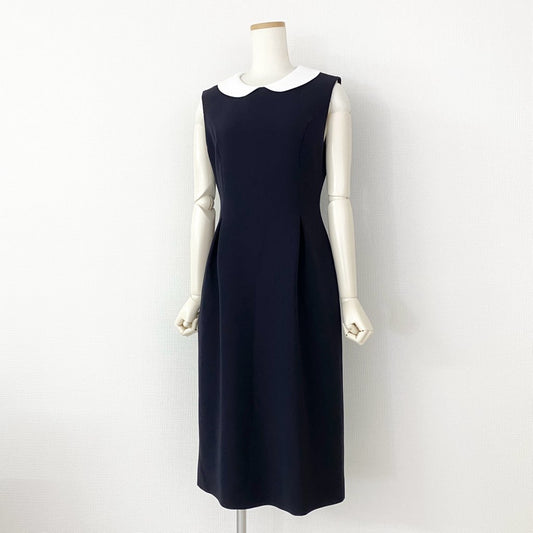 47h11 《美品》 定価57.200円 日本製 Rene ルネ 白襟 ノースリーブワンピース ドレスワンピース 膝丈ワンピース 襟取外◎ 5216250 サイズ36 ネイビー レディース