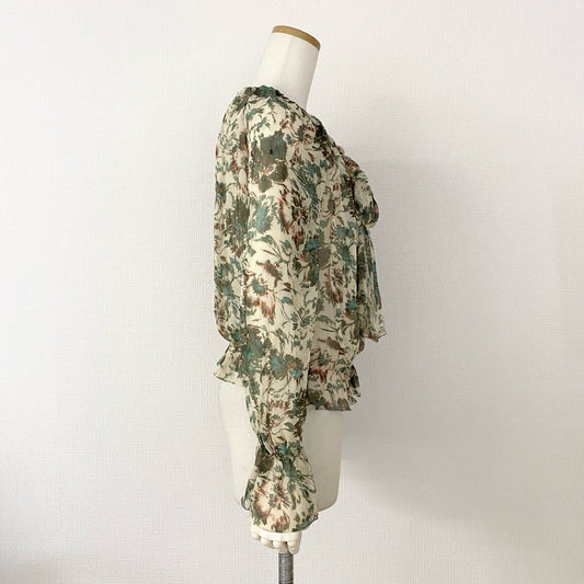37h10 EPOCA エポカ シルク フリルブラウス 40 ベージュ グリーン フラワープリント リボン ボウタイ 日本製