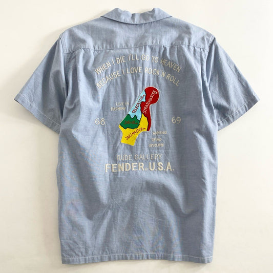 59g26 《美品》 RUDE GALLERY × FENDER ルードギャラリー フェンダー 半袖シャツ オープンカラー 開襟 ロゴ刺繍 日本製 ギタートップ 4 Lサイズ相当 ブルー コットン