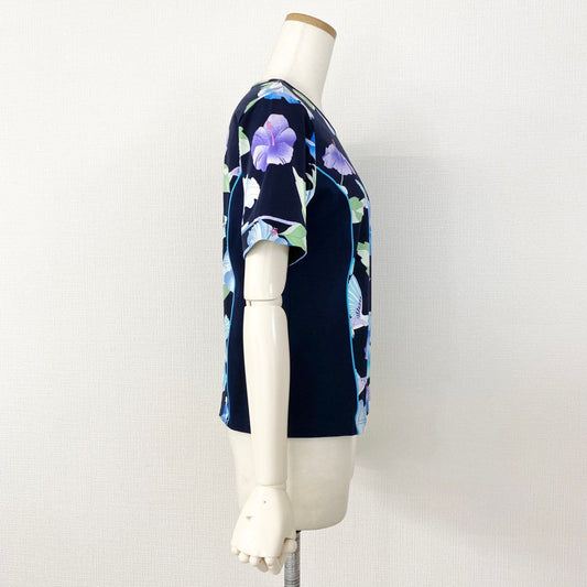 54b4 《美品》 LEONARD レオナール フラワープリントカットソー L ブラック Tシャツ 日本製 花柄 コットン 蝶