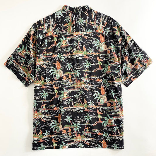 25b5-2 日本製 Papas パパス 半袖シャツ アロハシャツ 葉巻柄 総柄シャツ L ブラック 麻 リネン100% メンズ