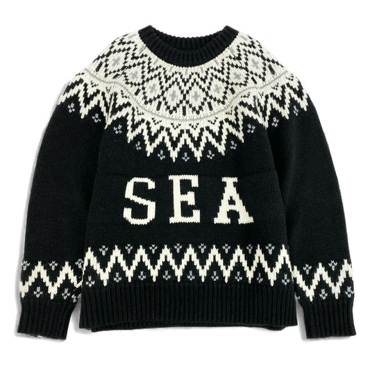 49L8 【美品】WIND AND SEA ウィンダンシー ノルディックセーター ニットセーター クルーネック 厚手 WKN-23-Q2-KN-03 Lサイズ ブラック ホワイト メンズo07t