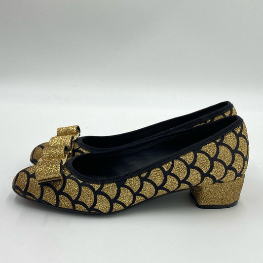 5h29《美品》 Salvatore Ferragamo サルヴァトーレフェラガモ VARA MER ヴァラリボン グリッターパンプス 5 ゴールド ブラック ラメ シューズ 希少モデル 箱 保存袋付属t18r