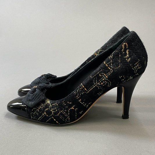 1h15《美品》 CHANEL シャネル TWEED PATENT RIBBON PUMPS ココマーク リボン ツイードラメパンプス G31387 36 1/2 ブラック 箱 保存袋付きt18r