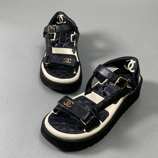 1i4 《美品》 CHANEL シャネル ココマーク マトラッセ 厚底サンダル G38880 38C ブラック ホワイト シューズ 即完売品 MATELASSE SANDALt18r