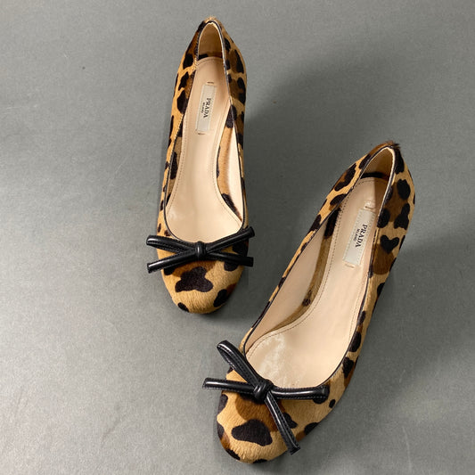 1A14 《極美品》 PRADA プラダ レオパード リボンパンプス 37 1/2 ブラウン ハラコ イタリア製 シューズ