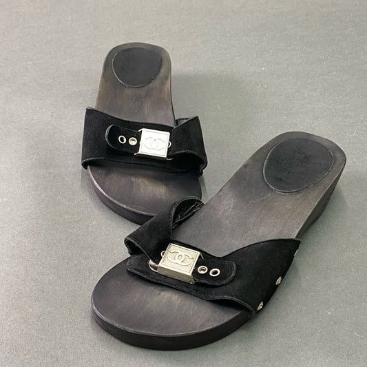 4f4 《美品》 CHANEL シャネル ココマーク メタルバックル ウッドサンダル 37 ブラック レザー シューズ 夏