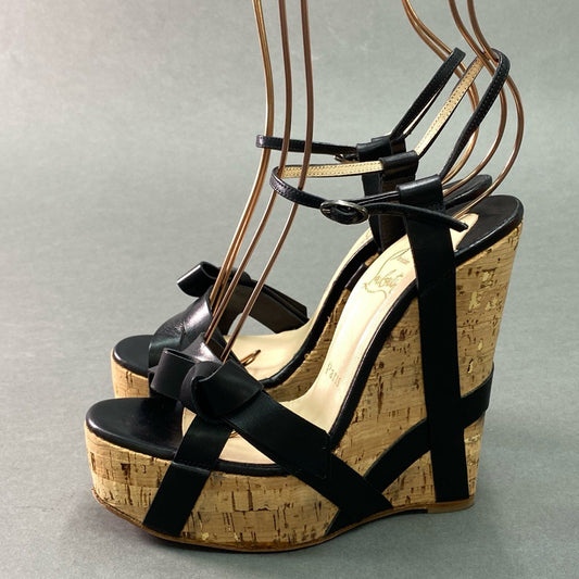 9f4 《美品》 Christian Louboutin クリスチャンルブタン ウェッジコルクソール レザーリボンサンダル 36 1/2 ブラック leather シューズ 保存袋 箱付き