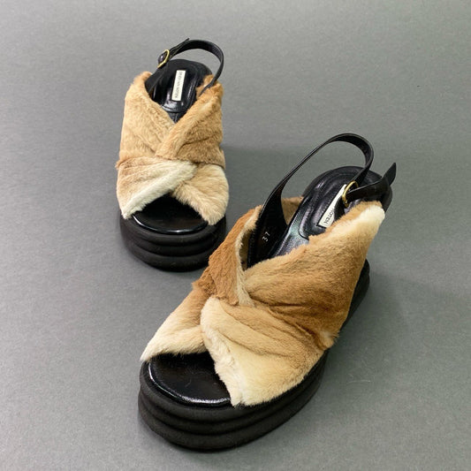 1e26 DRIES VAN NOTEN ドリスヴァンノッテン ウェッジソール スリングバック ファーサンダル 37 ブラック ベージュ シューズ 夏 イタリア製