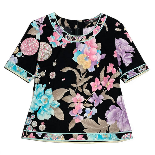 22d18 LEONARD レオナール 半袖カットソー カンカン素材 美しい花柄プリント トップス 0139222 38サイズ マルチカラー レディース 女性用u02t