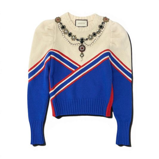 Id20 GUCCI グッチ 装飾ニットセーター パールビジュー刺繍 トップス イタリア製 Mサイズ マルチカラー ウール100% レディース 女性用nu1