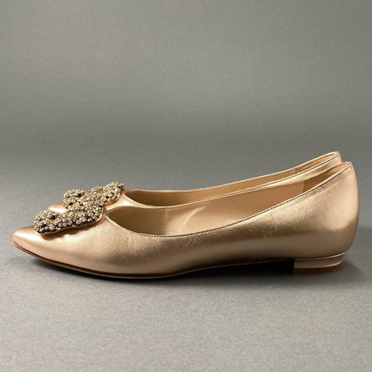 1f24 イタリア製 MANOLO BLAHNIK マノロブラニク ビジューバックル フラットシューズ フラットパンプス ポインテッド 36 1-2 メタリック ピンクベージュ レディース