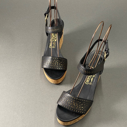 7f26 Salvatore Ferragamo サルヴァトーレフェラガモ スターパンチング ウェッジソールサンダル ストラップサンダル サイズ7D ブラック レディース 女性用 靴